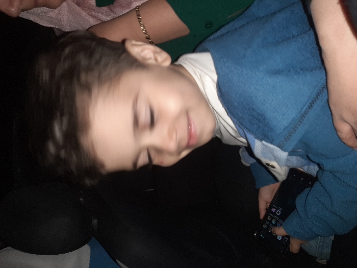 A young child, appearing to be male, is seated in a dimly lit interior, consistent with a vehicle's passenger compartment