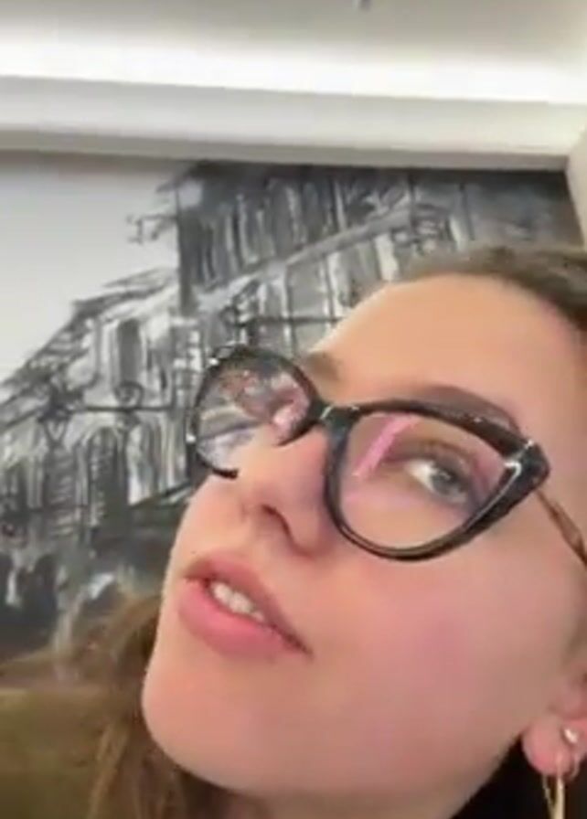 young woman with brown hair and blue eyes, wearing glasses and a green sweater, speaking to the camera. Her earrings are visible. Behind her is a black and white drawing on the wall. She holds up a small, light pink rectangular case that has gold lettering that says "Alaia Paris" on it. She states that her glasses are the first thing she carries.