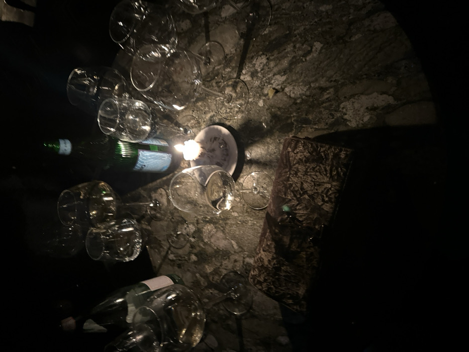 A dimly lit, textured surface supports an array of scattered wine glasses and bottles. A lit candle sits atop a small plate, casting a warm glow. A patterned, perhaps velvet, bag lies to the side. The darkness dominates the edges of the scene, creating a sense of intimacy and seclusion.