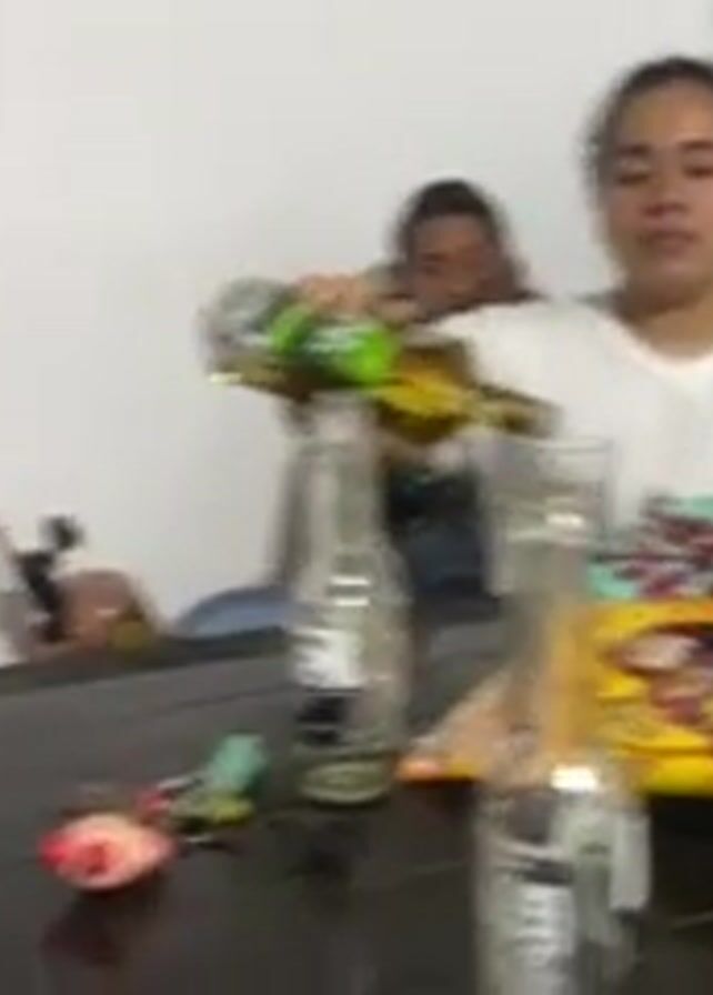Three women are sitting around a dark wood table with drinks and snacks. A woman in a white t-shirt is pouring a dark-colored liquid from a green bottle into a glass. There are empty Corona beer bottles, a bag of "De Todito" chips, a green plastic shopping bag, a collection of keys with a pink ornament, and other bottles on the table. Another woman in a white t-shirt sits beside her, and a third woman in a tan tank top is seated further left. The woman in the tan tank top is laughing with her hand covering her mouth. The background is a plain white wall with various items in the corner, including what appears to be a child's bicycle. The scene suggests a casual gathering with drinks and snacks in a home.