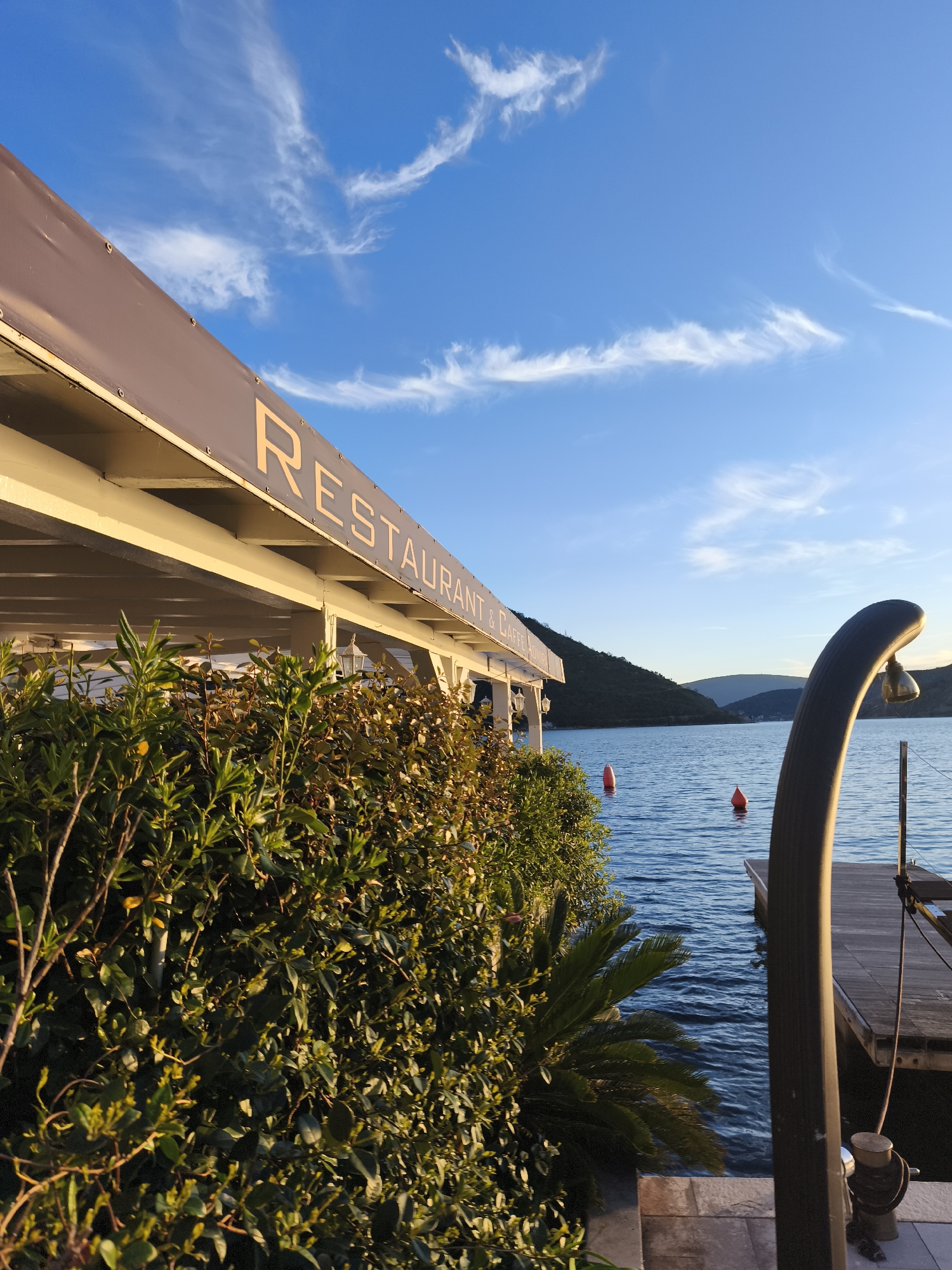 waterfront restaurant in Perast, Montenegro. The restaurant has a brown awning with "RESTAURANT & CAFFE" printed on it in gold letters. There is a dense green hedge and a small palm tree in the foreground, partially obscuring the view. Beyond the restaurant and foliage, the blue water of the bay is visible. Two red buoys float on the water's surface. A wooden dock extends into the water on the right side of the frame, with a dark metal shower fixture positioned on the dock near the foreground. The sky is blue with scattered white clouds. Hilly terrain forms the background across the bay. The time of day appears to be late afternoon or early evening based on the lighting.