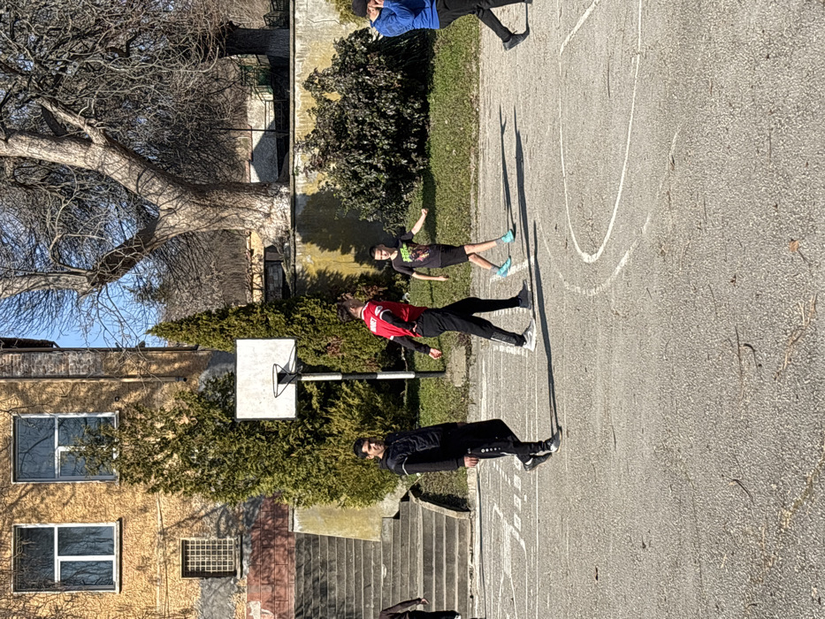 An outdoor scene in Slavyanovo, Bulgaria, depicts a group of four males on an asphalt court under clear, sunny conditions