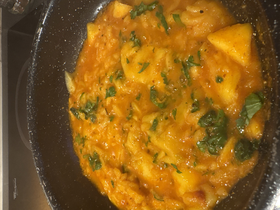 A close-up shot shows a pan filled with a vibrant, orange-hued dish. Chunks of yellow fruit, possibly mango or squash, are interspersed throughout. Green herbs, coarsely chopped, are scattered on top, adding a fresh element to the dish. The sauce appears thick and glossy. The pan is non-stick with a black rim.