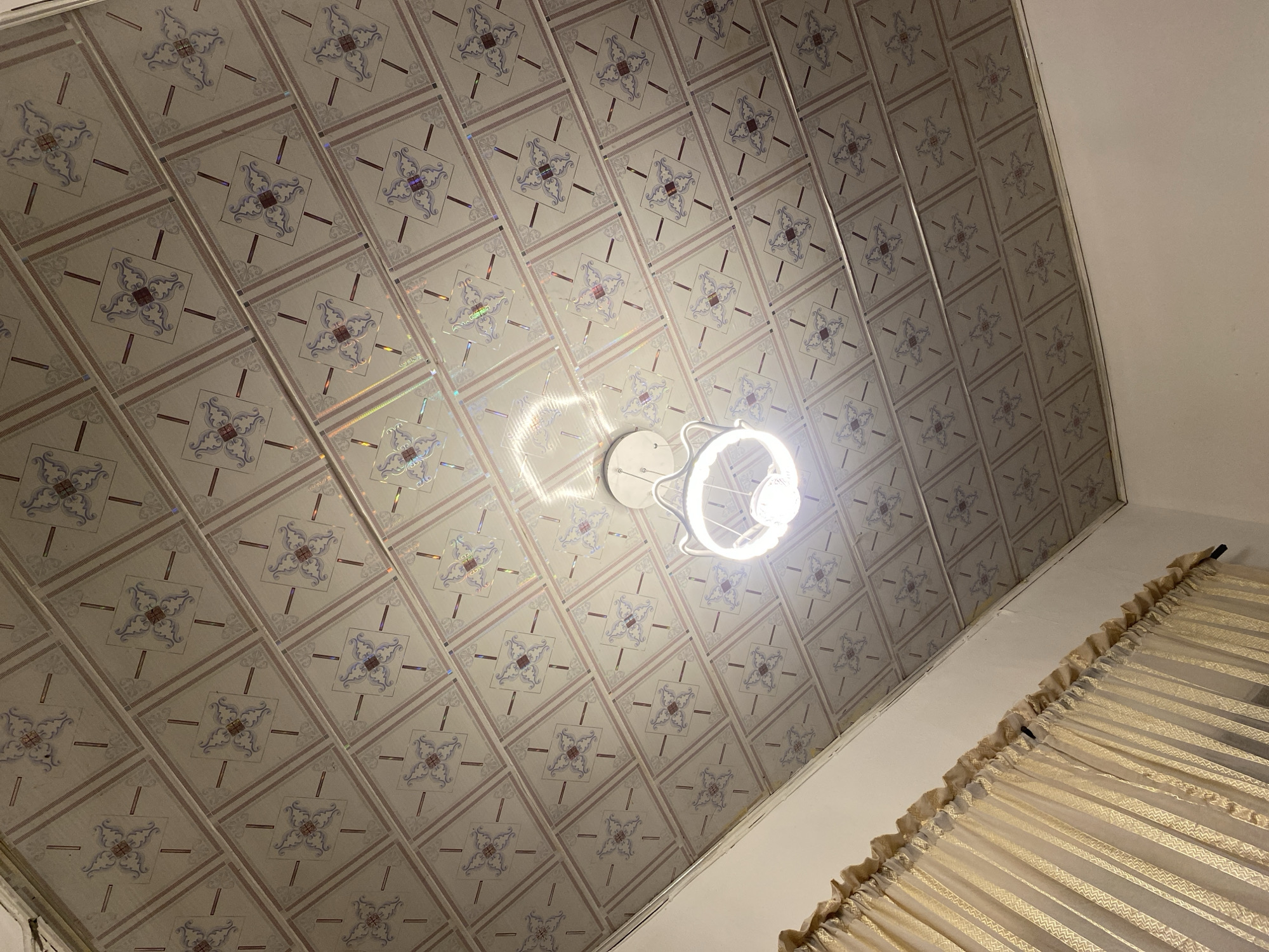 - "ceiling with patterned square tiles, a circular light fixture with a ring light, and a partial view of beige curtains" by FM-4Jqiz1, licensed under CC BY 4.0
