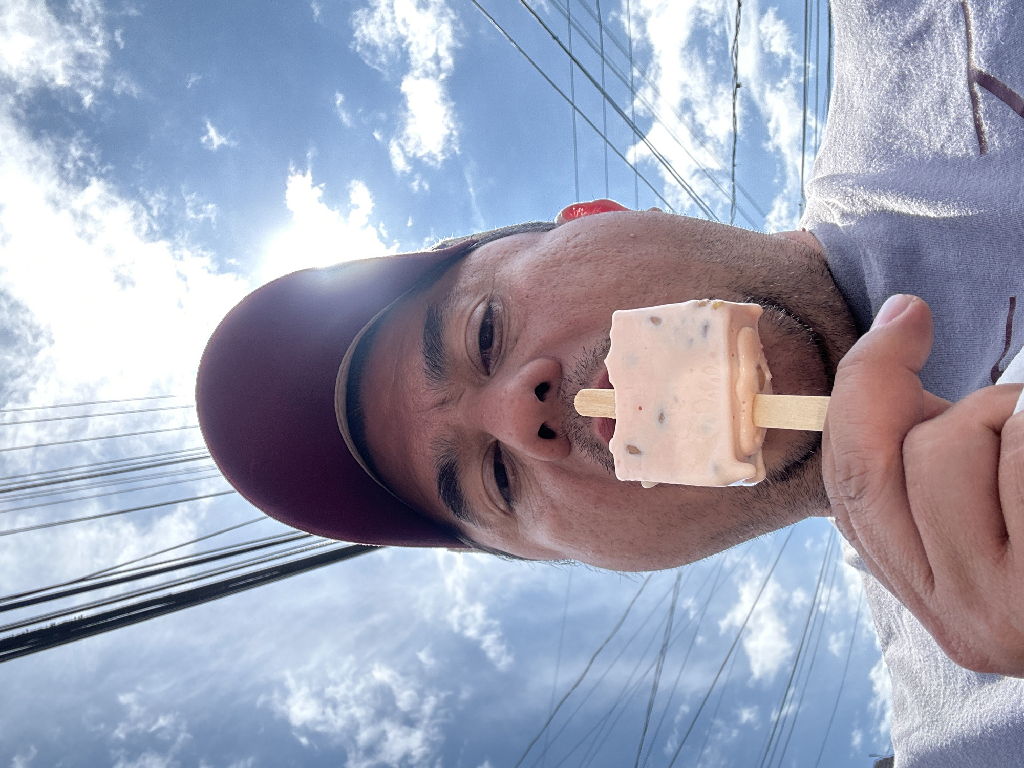A man with a maroon baseball cap is holding a popsicle in front of his face. He is wearing a gray shirt. Overhead power lines are visible above him. The sky is blue with scattered white clouds. The image was taken in Chipilo de Francisco Javier Mina (Chipilo), Mexico.