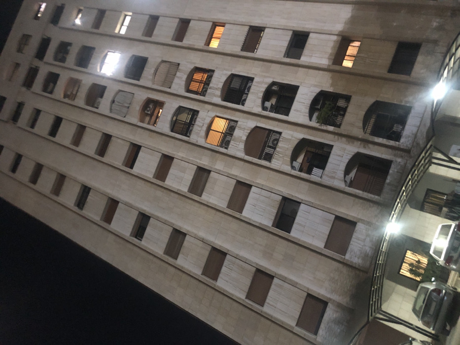 This image displays a multi-story residential building at night in Kafr Sousa Municipality, Syria