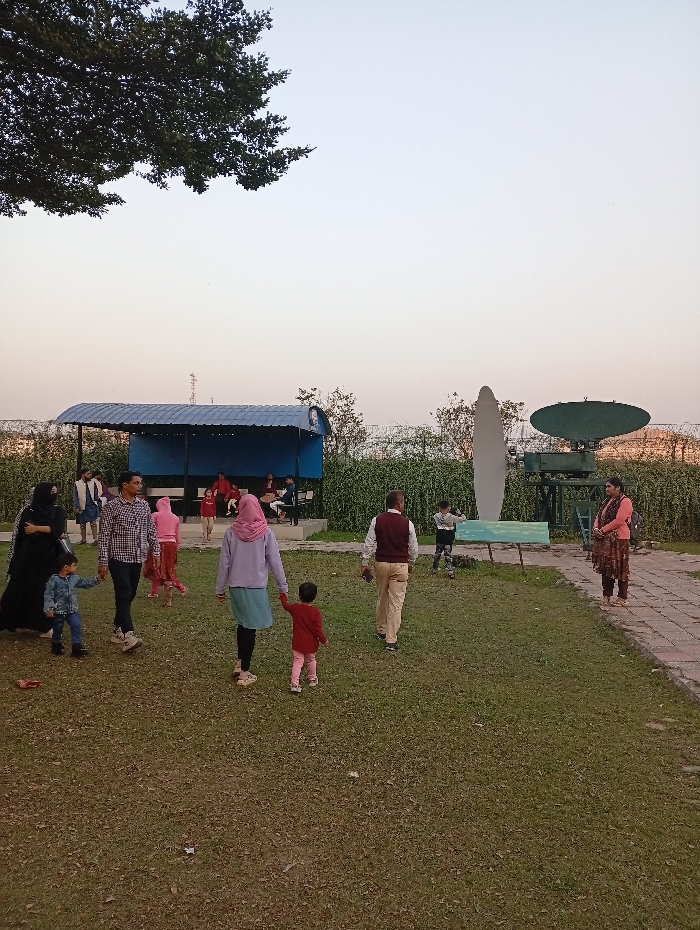 The image depicts an outdoor area of the Bangabandhu Sheikh Mujibur Rahman Novo Theatre in Dhaka, Bangladesh, during late afternoon. A manicured green lawn occupies the foreground and midground, with a paved pathway visible along the right edge. The sky above presents a clear, light orange gradient. On the left side of the midground, a blue-roofed, open-sided shelter contains approximately five individuals, including adults and at least one child. To the left of the shelter, a woman in a black abaya stands with a child. Adjacent to her, a man in a plaid shirt walks alongside a boy in a blue denim jacket. In the central area, a woman in a light purple tunic and light blue skirt holds the hand of a small child in a red top and pink pants; both walk away from the viewer. To their right, a man in a maroon vest over a white shirt and khaki pants also walks away from the viewer. A small child in a blue shirt is observed on the lawn near a light blue bench in the mid-right. Prominent outdoor exhibits on the right side of the lawn include a tall, white, conical structure, possibly a rocket replica, and a large, dark green parabolic satellite dish with a white feed horn. On the paved pathway at the far right, a woman in a peach-colored top and patterned skirt stands facing left. The background consists of dense green foliage, functioning as a fence or border, with indistinct industrial structures visible beyond it. A large tree branch with dark green leaves extends into the upper left quadrant of the frame. A total of approximately 15-20 individuals, comprising adults and children, are present across the scene, engaged in walking, standing, or sitting.