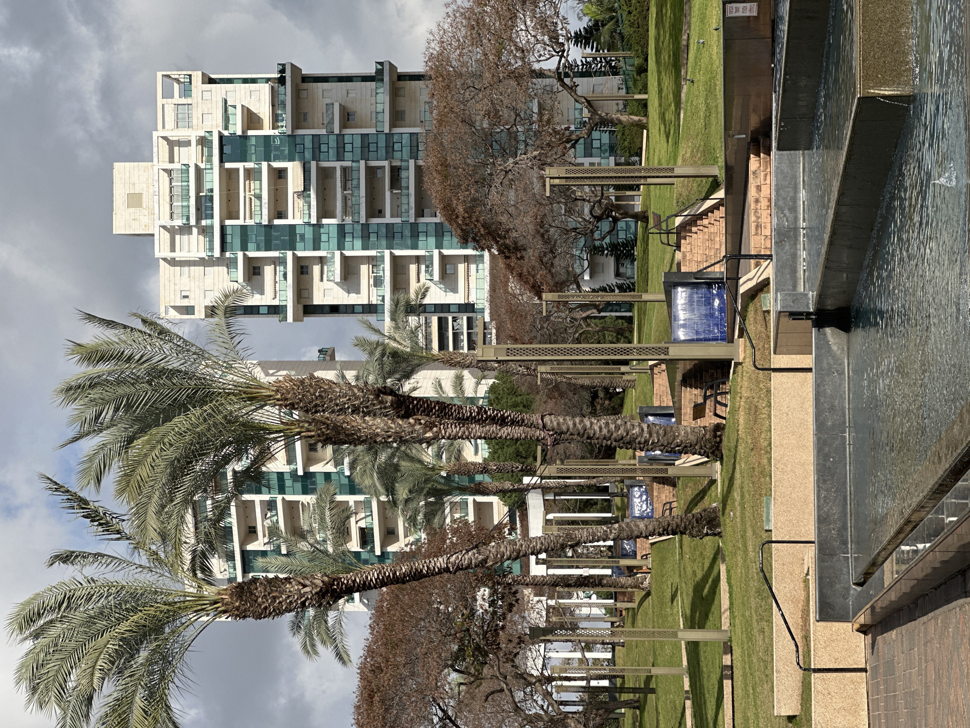 This image depicts a structured urban park landscape in Ramat Gan, Israel, with two prominent high-rise residential buildings in the background. The foreground features a multi-tiered, dark-colored rectangular fountain with visible flowing water, casting reflections. A brick-paved path runs along the immediate left of the fountain. Beyond the fountain, the park slopes upward, characterized by manicured green grass and several mature palm trees with rough trunks and green fronds. Numerous leafless or brown-leaved deciduous trees are interspersed throughout the park, indicating a late autumn or winter season. The park incorporates architectural elements such as light-tan brick retaining walls, stepped pathways, and dark-colored metal handrails. Vertical metal poles with lattice patterns are regularly spaced, possibly serving as light fixtures or decorative structures. A blue vertical panel, resembling a waterfall feature, is embedded into one of the brick terraces. Several dark benches are visible on the grass and near the terraces. No human figures are present, but a few small birds are discernible on the grass in the midground. In the background, two multi-story residential towers dominate the skyline under a partially cloudy sky. These buildings feature light-colored facades (likely concrete or stone) and numerous balconies with blue-green glass railings and window panels, exhibiting modern architectural design with varied setbacks and protrusions. The building on the right has a distinctive, blocky penthouse or rooftop structure.
