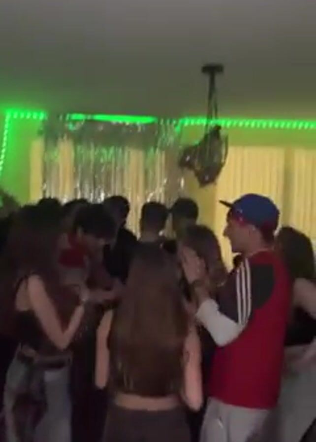 A group of teenagers are dancing in a dimly lit room. Most of them are facing the camera, but their faces are mostly obscured by the people in front of them. A few individuals wear baseball caps, while the rest are not wearing any headwear. The group mostly consists of girls with long hair. The room is decorated with tinsel and a green neon light around the ceiling. A chandelier is also visible in the room. The teens are dancing and moving around.