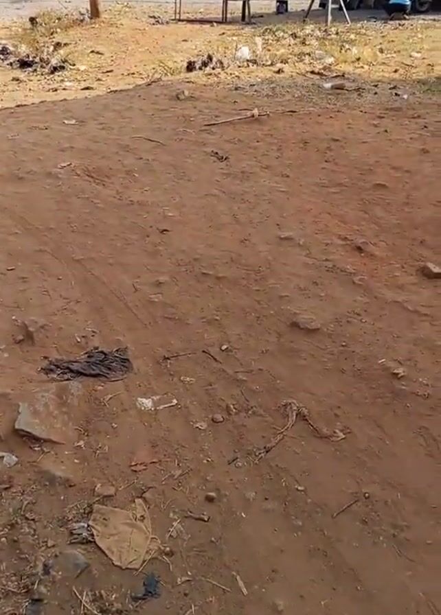 scene of a dusty, dirt road in what appears to be a rural or underdeveloped area. The ground is reddish-brown and littered with debris including plastic, rags, and small stones. In the background, a building with corrugated metal siding is partially visible. To the left of the building, there's a wooden table with two benches. A person wearing a yellow shirt is standing behind the table, while another person in a blue shirt is kneeling near the building, possibly working on something. Further to the left, a white bus and a semi-truck pass by on a paved road in the distance. Palm trees and the roofs of buildings can be seen in the far background, suggesting a residential area. The overall impression is of a roadside location with signs of human activity and environmental degradation.