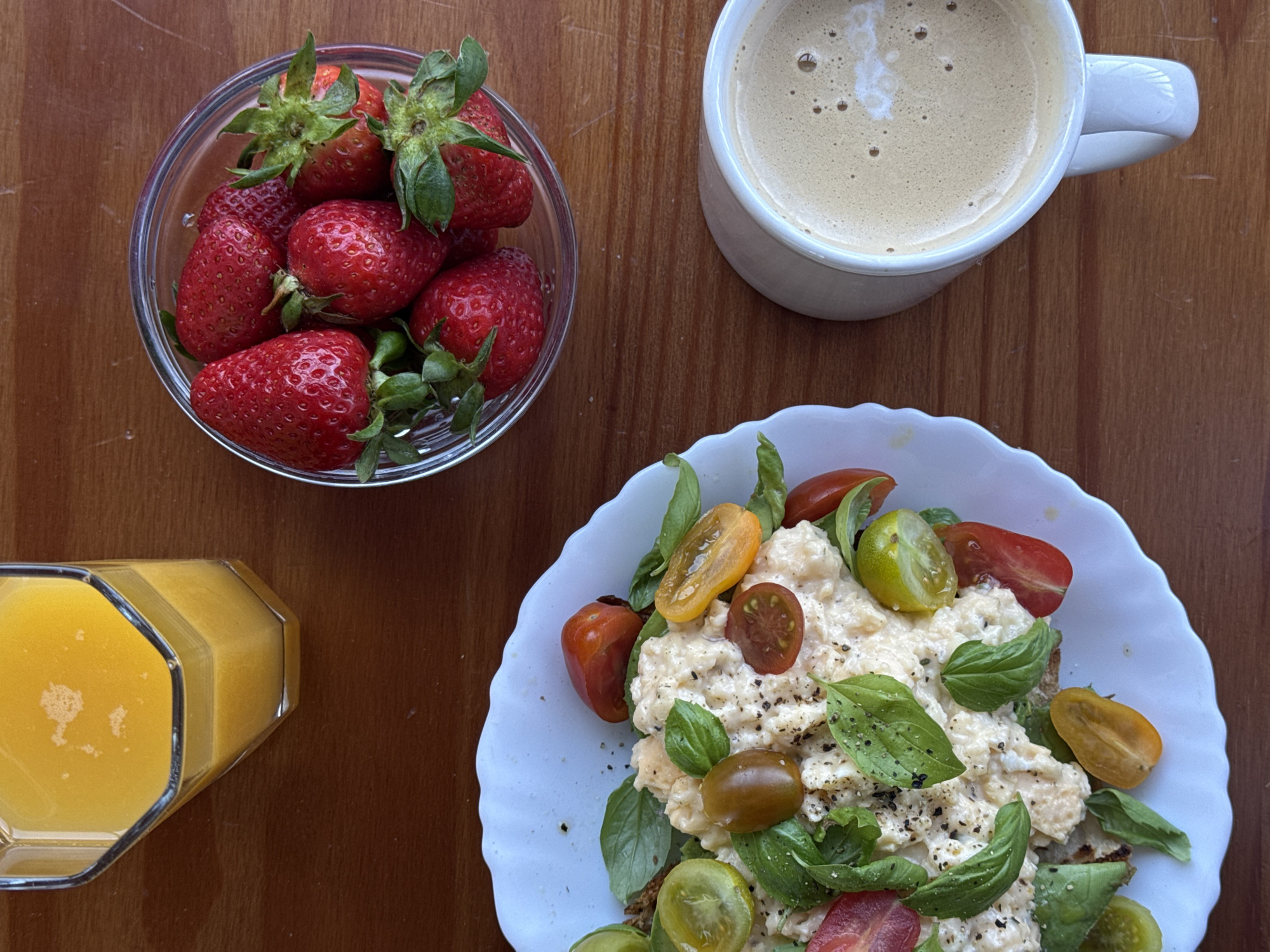 An overhead forensic view reveals a breakfast or brunch setting on a reddish-brown wooden table in Vila Nova de Gaia, Portugal. In the lower-left, a white, scallop-edged plate holds a serving of scrambled eggs, topped with various halved cherry tomatoes (red, green, yellow-orange) and fresh green basil leaves, lightly seasoned with black pepper. Partially visible beneath the eggs is a base, likely toast. The upper-left quadrant contains a clear, hexagonal glass filled with orange juice, exhibiting a small amount of foam on the surface. In the upper-right, a clear glass bowl is filled with whole, ripe red strawberries, each retaining its green stem and leaves. The lower-right quadrant features a white ceramic mug containing a light brown, frothy beverage, consistent with coffee with milk. No human subjects are present in the scene, which depicts a prepared meal arranged for consumption.