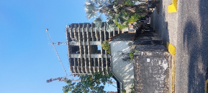 An unfinished concrete skyscraper rises against a bright blue sky, construction cranes looming above. Adjacent is an older, weathered building, its walls showing age and decay. Lush trees and plants add a touch of green to the scene. A paved road runs alongside, marked with yellow-painted edges, suggesting a blend of old and new within an urban environment.