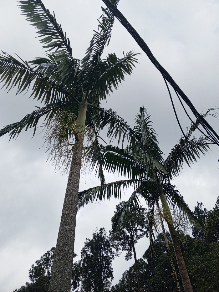 The image captures a low-angle view of two tall palm trees against a cloudy sky. The palm trees dominate the frame, with their textured trunks reaching upwards. Power lines intersect the upper right corner of the scene. Lower in the frame, a collection of leafy trees forms a dense background, contrasting with the overcast sky. The overall composition emphasizes the height of the palm trees and the layered vegetation.