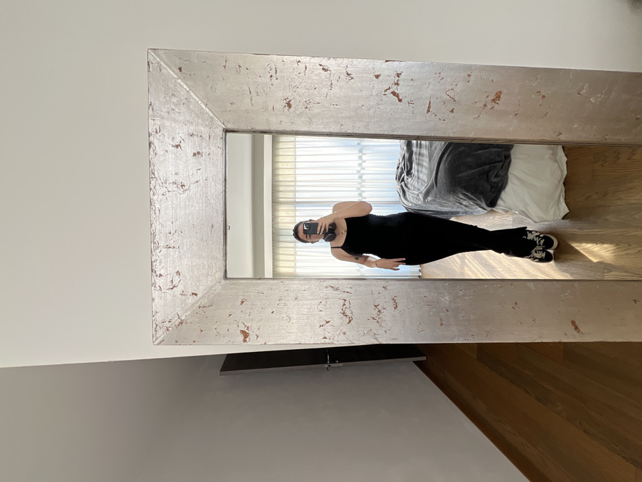 A person wearing a black dress and sneakers is reflected in a large rectangular mirror with a silver frame