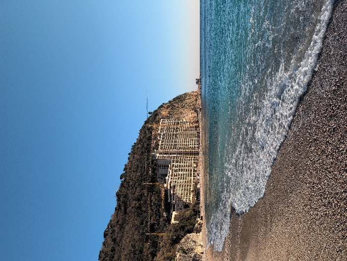 The image depicts a coastal scene in Perazića Do, Montenegro. In the foreground, a coarse pebble beach extends across the lower left portion of the frame, where small white-capped waves from the Adriatic Sea break and recede. The sea, characterized by its clear turquoise-blue water, occupies the right half of the image and extends to the horizon under a clear, cloudless light blue sky. Along the left side, a steep, densely vegetated hillside or mountain rises directly from the beach. Situated at the base of this hillside and extending along the coastline into the midground is a large, multi-story building complex. This structure features a prominent grid-like facade, suggesting multiple balconies or window openings, and appears to be under construction or partially unfinished. At least three tall construction cranes, one yellow and two white, are visible near and above the building complex and on the adjacent hillside, indicating ongoing development. A rocky promontory extends into the sea on the far right. No discernible individuals are present in the visible portion of the scene.