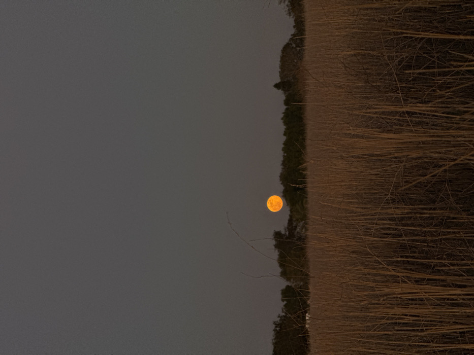 The scene captures an outdoor landscape at night in Shefayim, Israel. The upper two-thirds of the frame consists of a dark grey sky. A prominent, spherical, orange-yellow full moon is positioned in the upper-middle, slightly left of center. Below the moon, a horizontal line of dark-toned trees and dense foliage forms the distant treeline. The lower third of the image is dominated by a field of upright, dry, light brown to straw-colored reeds or tall grasses. There are no individuals, overt actions, or identifiable artificial structures within the visual field.