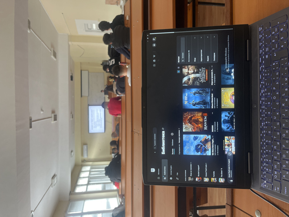 The image presents an interior view of a lecture hall or classroom situated in Pravets, Bulgaria. In the immediate foreground, a black laptop is open on a light brown wooden desk, its screen displaying the Epic Games Store "Библиотека" (Library) interface in Cyrillic, featuring visible game titles such as "We Were Here Together," "RAVEN2," "Where Winds Meet," and "Game of Thrones," along with other game icons. The laptop's keyboard is illuminated with blue-white backlighting. In the midground, approximately 15-20 individuals are seated in multiple tiered rows of wooden desks and benches, facing the front of the room. Most individuals are partially obscured, with one prominent figure wearing a red shirt in the center-right and another in a black jacket with a white "5" on the back. The background shows the front of the classroom, where a large white projection screen is mounted on the wall. To its left, a flat-panel display shows a presentation with text in Cyrillic. A figure, likely an instructor, stands near these displays, facing the seated individuals. The room features light yellow walls, ceiling-mounted fluorescent lights, and an air conditioning unit on the left wall. Large windows with horizontal blinds are visible on the left side, admitting natural light.