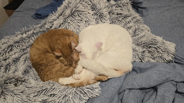 The scene depicts a bedroom inside a residence in Unknown, Unknown. No human subjects are present. Two domestic cats are observed sleeping intertwined on a bed. The cat on the left is orange-ginger, curled tightly into a ball. The cat on the right is white with faint light orange markings, also curled into a ball and facing the orange-ginger cat. Its left front paw rests over the orange-ginger cat's right front paw area. Both cats' eyes are closed. They are resting on a grey, shaggy faux fur blanket, which covers a blue-grey bedsheet patterned with subtle leaf or chevron designs. A crumpled blue textile is visible on the bedsheet in the upper left background.