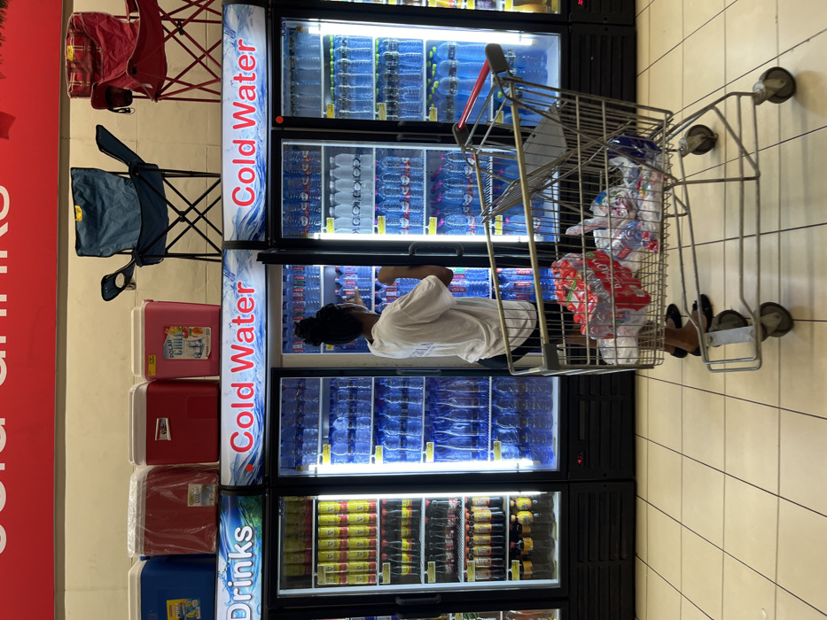 The image portrays the interior of a retail establishment in Mile 11, Ghana. A person, seen from the rear, is positioned centrally, reaching into an open glass-fronted commercial refrigerator filled with clear plastic bottles of water. This individual wears a white t-shirt, dark shorts, and black flat shoes, with dark hair tied in a bun. To the left, a similar refrigerator is stocked with various bottled beverages, and to the right, two additional refrigerators are also filled with bottled water. Above these units, a red sign with white lettering reads "COLD DRINKS" and "Cold Water" on the refrigerator headers. On top of the refrigeration units, four large coolers (one blue, two red, and one pink "Polar Chill" brand) are stored alongside a blue and a red folding outdoor chair. In the foreground, a metal shopping cart contains multiple clear plastic water bottles, some in red "DAGBO" brand packaging, and other items in plastic bags. The floor is covered with light-colored square tiles, and the area is brightly illuminated by overhead lighting.