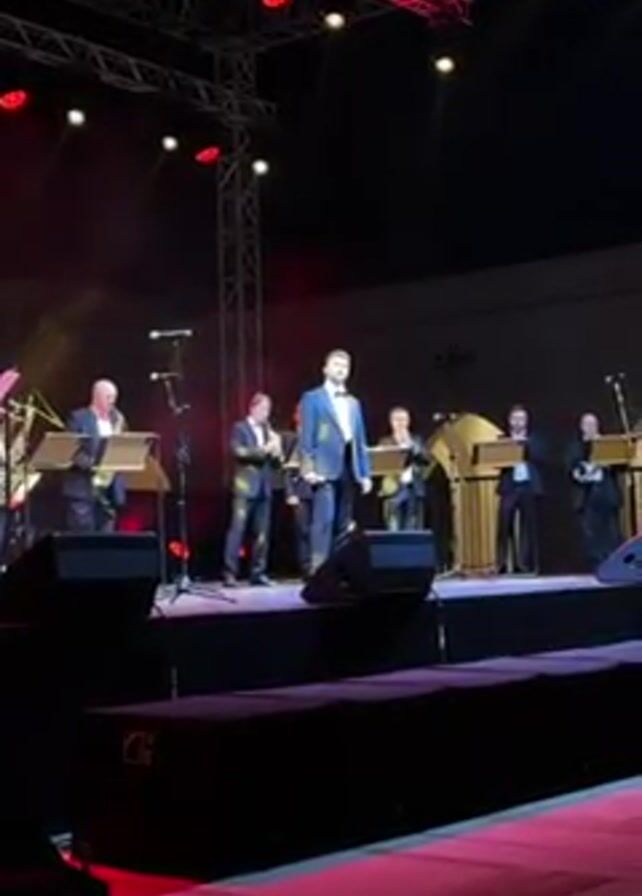 man in a suit singing on a stage with a band. The band consists of five men, dressed in suits, playing instruments including saxophones, a flute, and a clarinet. The stage is dark with red spotlights shining down. In the background is a building with the word "Adda" visible on the wall. A truss with more lights is visible above the stage. There are speakers along the front edge of the stage. Someone is throwing a yellow balloon at the beginning of the video.