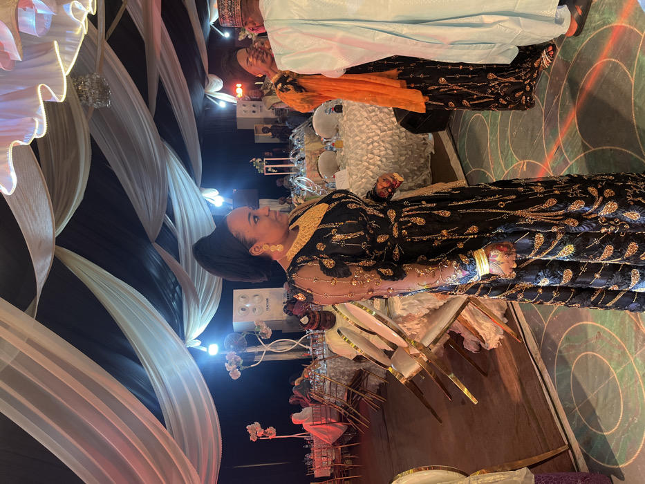 A woman wearing a dark dress with gold detailing stands indoors. She has dark hair pulled back and is adorned with gold jewelry. Behind her, tables are set for a formal event, decorated with white linens and gold chairs. In the background, other people are visible, one wearing orange and another wearing blue. Overhead, the ceiling is draped with white fabric. The lighting is a mix of warm and cool tones.