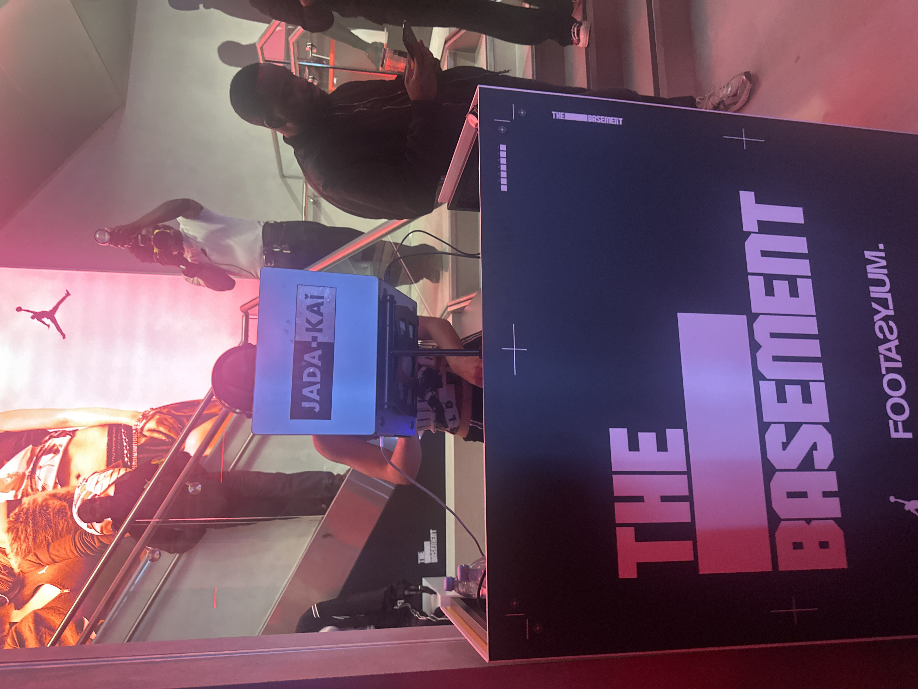 A brightly lit space showcases promotional material. "The Basement" is prominently displayed on a large black sign, alongside "Footasylum." A smaller screen reads "Jada-Kai." Individuals are seen in the background, one with a camera. A staircase is visible. The overall scene appears to be an event or promotion related to fashion or footwear.