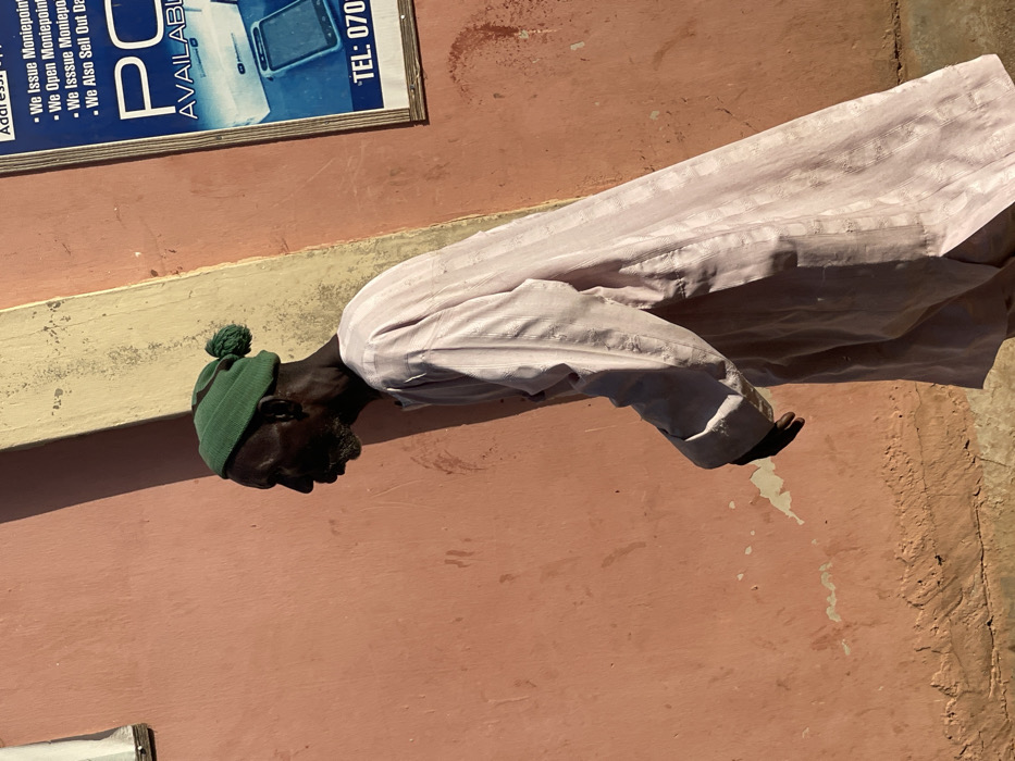 An elderly dark-skinned male is depicted in profile, walking or standing outdoors in Samaru, Nigeria