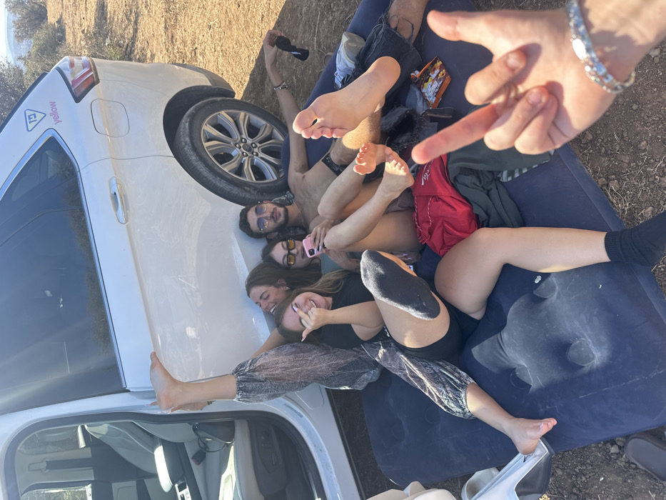 The image depicts an outdoor scene featuring five individuals in a dry, rural landscape within the Mate Yehuda Regional Council, Israel. Four individuals are positioned on a deflated blue air mattress, leaning against the rear passenger side of a white SUV with its door open. The SUV is parked on light brown dirt ground with sparse, dry vegetation visible in the background, and features a yellow "yellow" logo with Hebrew text on its rear passenger window. From left to right on the air mattress: 1. A female, partially visible, has her bare right foot elevated, resting on the SUV's open rear door frame. She wears patterned sheer pants. Her face is mostly obscured. 2. A female with long hair smiles towards the camera, extending two fingers in a gesture commonly known as a peace sign. She is dressed in a black t-shirt and black shorts, with her left foot covered by a black sock, sole facing the camera. 3. A female wearing sunglasses is looking down at a pink smartphone held in her hands. Her legs are bare, and she wears a light green top. 4. A shirtless male with a beard and sunglasses reclines. He holds dark sunglasses in his left hand, and his bare feet are visible. A fifth individual's right arm, adorned with a silver-toned bracelet, is visible in the foreground, displaying a "rock on" hand gesture. Miscellaneous items, including a red bag and other clothing, are strewn across the air mattress. The scene is illuminated by strong daylight, casting visible shadows.