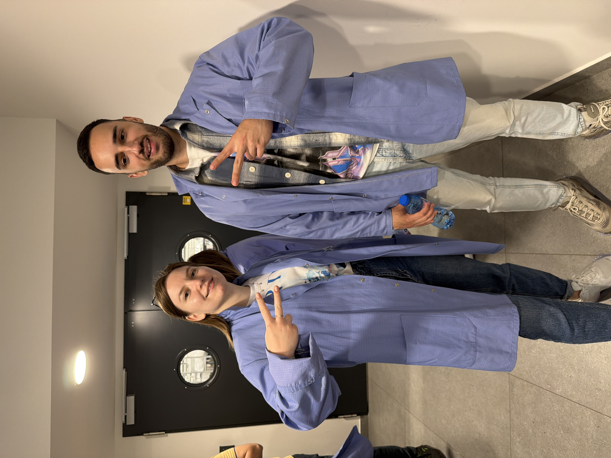 Two people, a man and a woman, are standing indoors and posing for a photograph. They both wear open light blue lab coats. The man, standing at the top of the image, has dark hair and a beard, and he holds a water bottle in one hand, making a peace sign with the other. He wears a plaid shirt, a t-shirt, and light-colored jeans. The woman, standing in front of him and slightly below, has long hair and wears a t-shirt and dark jeans. She also makes a peace sign with her hand. Behind them are double doors with circular windows. The location appears to be indoors, possibly a hallway or corridor in a building, with a light fixture on the wall. The location is not explicitly verifiable as Plovdiv, Bulgaria based on this image alone.