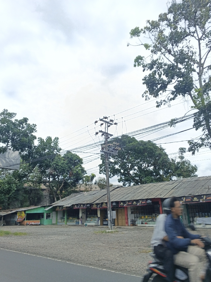 A street scene showcases a row of modest shops with corrugated metal roofs, shaded by trees and crisscrossed by utility lines. A green-painted building stands out at the left. The sky is overcast. A motorcycle with two riders passes by in the foreground, creating a slight motion blur. The road appears worn and rough.