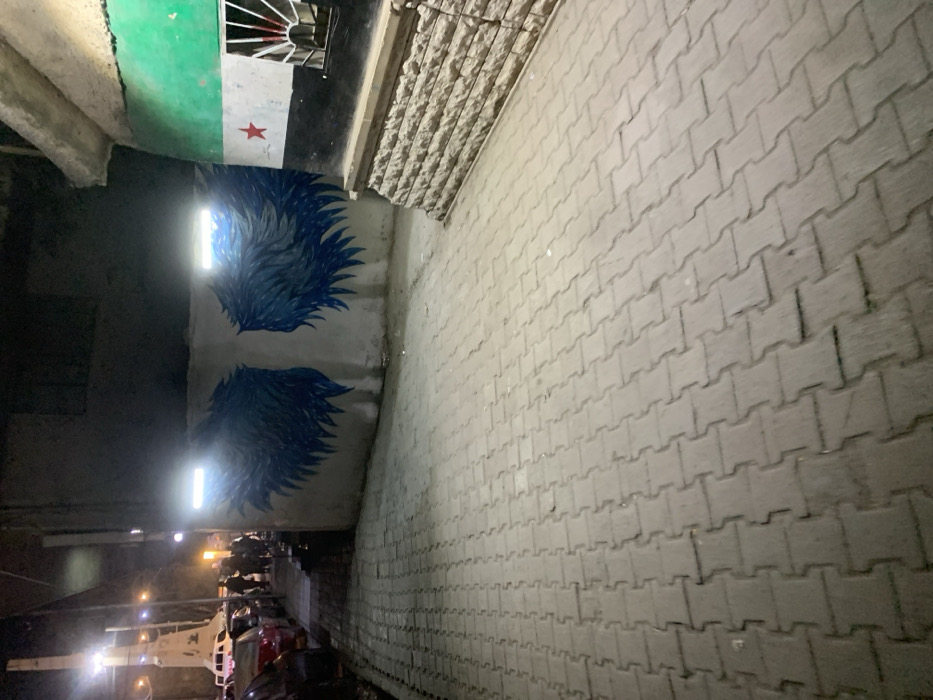 The image depicts a nighttime urban scene in Ma'raba, Syria. A paved walkway of interlocking grey concrete blocks occupies the foreground, extending into the middle distance. To the right, a building wall features a mural of large, blue and black stylized wings, illuminated by two rectangular LED lights mounted directly above. Adjacent to this, the wall transitions to another section painted with the Syrian opposition flag: horizontal stripes of green, white (with a red star), and black. Below the flag, the wall is constructed from light-colored, rough-hewn stone blocks, and a small, barred window with radial spokes is visible. To the left of the paved walkway, several parked cars, including dark and red sedans, line a narrow street. Beyond the vehicles, a group of indistinct individuals is visible, congregating near a tall, light-colored monument or obelisk illuminated by streetlights in the background. The overall environment is dimly lit by artificial light sources.