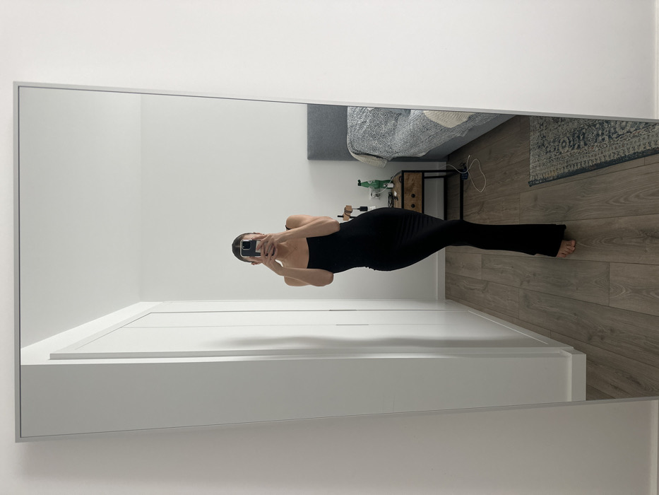 A full-length mirror selfie captures an individual standing barefoot in a room in Ericeira, Portugal