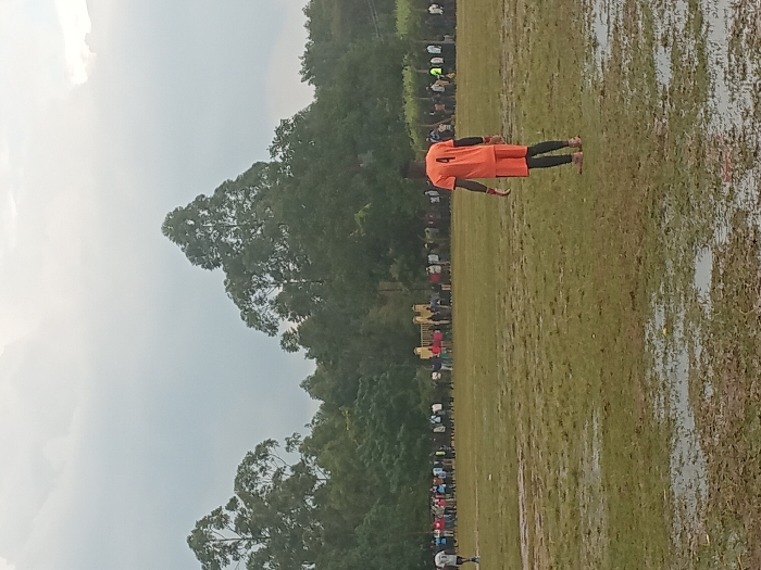 A person in orange sports attire stands on a waterlogged grass field. Behind them, a blurry line of spectators sits along the edge of the field, which is flanked by dense green trees. The sky is overcast and cloudy.