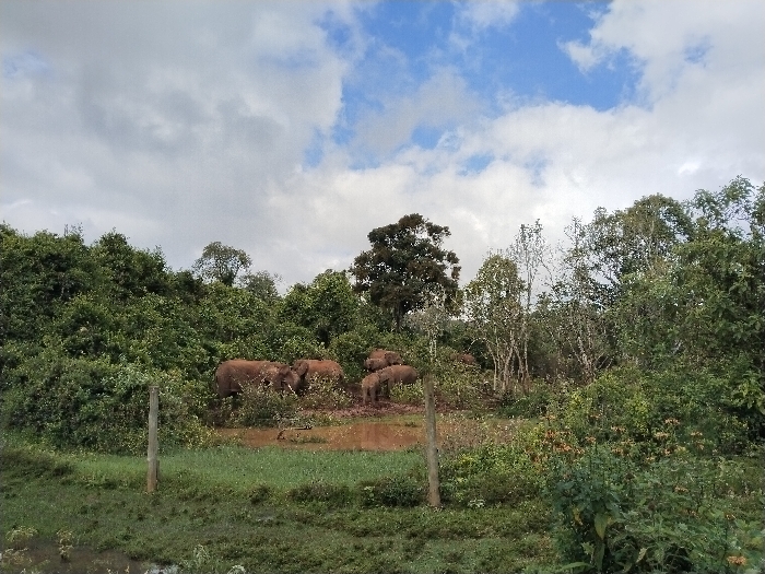 A group of elephants are standing in a muddy patch surrounded by lush green vegetation. The elephants are a brownish-grey color, blending in with the mud. The background consists of a dense forest with various shades of green trees and shrubs. The sky above is partly cloudy with patches of blue peeking through. A partially visible wooden fence runs across the foreground.