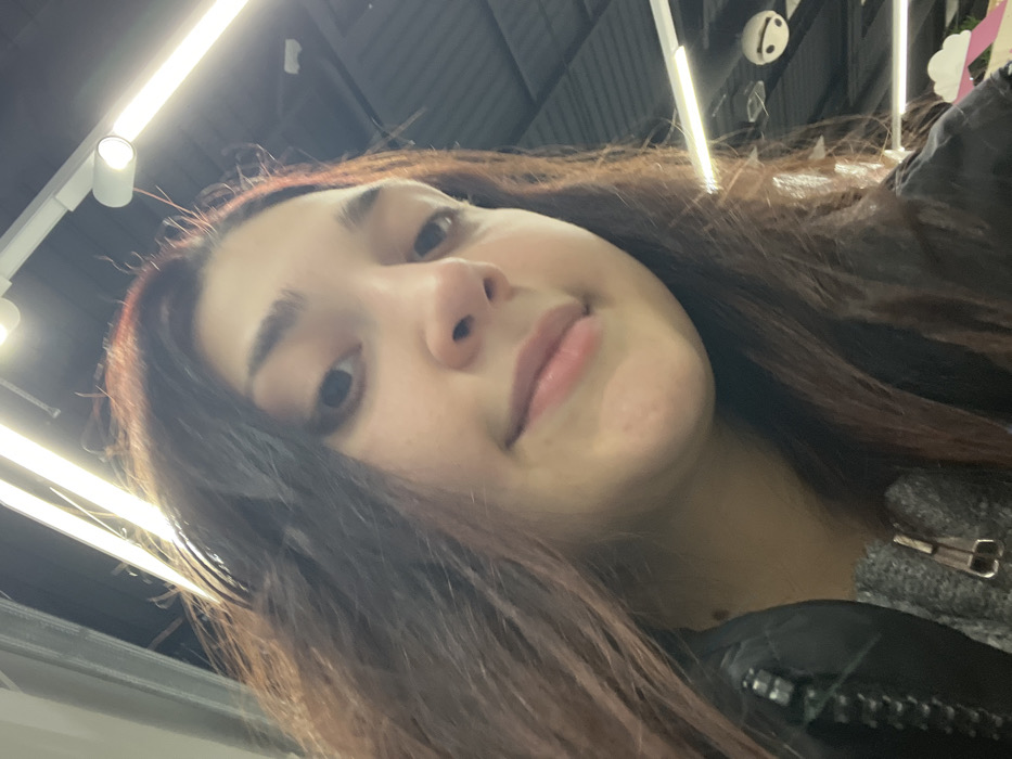 A low-angle, medium close-up selfie captures a young female individual indoors in Oberhausbergen, France. She possesses long, wavy dark brown hair with subtle reddish highlights and fair skin, with dark eyes directed towards the camera. Her expression features a subtle, closed-mouth smile. She is dressed in a black outer garment, partially revealing a grey inner garment with a prominent metal zipper. The background consists of a dark ceiling with visible linear and circular artificial lighting fixtures. On the right side of the frame, a white circular decorative object with minimalist black facial features is partially visible above a section of a colorful, abstract design, indicating a retail or commercial environment.