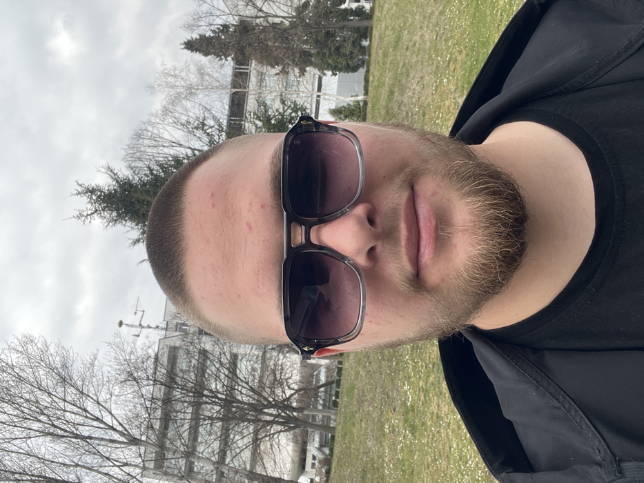 A male individual is depicted in a close-up, chest-up selfie-style photograph, directly facing the camera. He has a short, dark buzz cut and a light brown, trimmed beard. He is wearing large, square-framed sunglasses with dark grey to purple gradient lenses and clear grey frames with black accents. A small golden emblem is visible on the left temple of the sunglasses. His attire consists of a black t-shirt and a black jacket. The background reveals an outdoor setting under an overcast sky. A grassy area, sparsely dotted with small white flowers, is visible in the lower half of the background. Behind the individual, several deciduous trees, largely bare, are interspersed with evergreen conifers. Multiple multi-story buildings are visible in the distance. To the left, a light-colored, multi-windowed building, consistent with institutional architecture, is prominent. On its roof, a metallic mast supporting various antennae or sensors is clearly observable. This architectural complex and specific mast are characteristic of the American University in Bulgaria campus in Blagoevgrad, Bulgaria. The overall environment suggests a late winter or early spring season. No specific actions or interactions are depicted beyond the individual posing for the photograph.