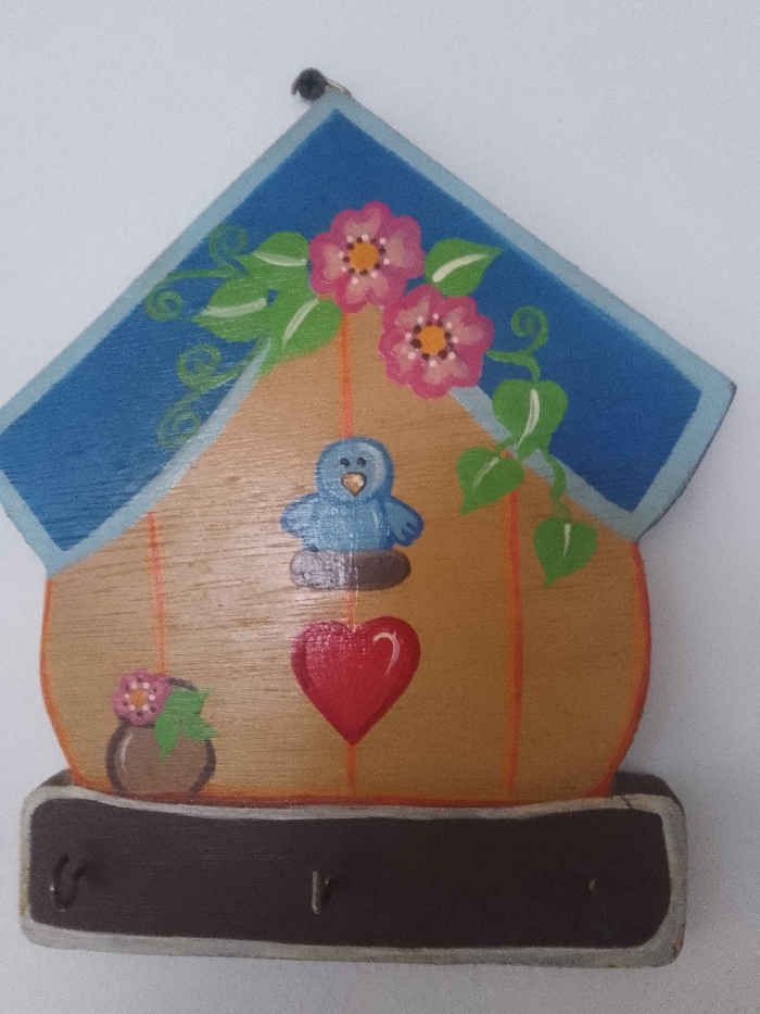 - "A painted wooden decorative key holder, shaped like a stylized house or birdhouse, is depicted against a plain white background" by FM-Juqnh1, licensed under CC BY 4.0