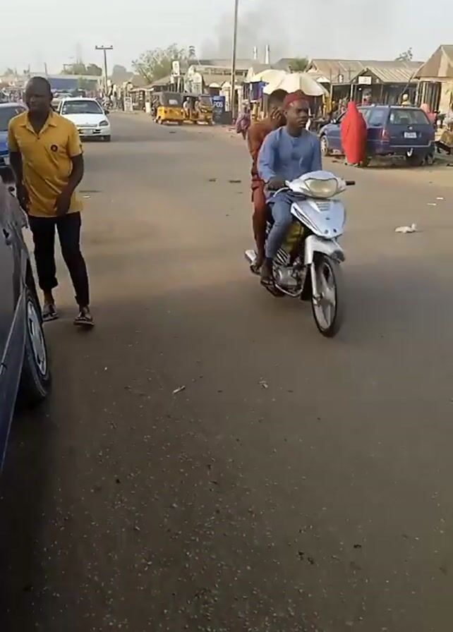 street scene in what appears to be a small town or village. People are walking and riding motorcycles on the road. There are buildings and small shops lining the street. A man in a yellow shirt is standing by a parked car. Smoke can be seen in the distance. There are power lines overhead. Several vehicles are parked along the road. The overall environment seems somewhat dusty and the buildings are fairly simple.
