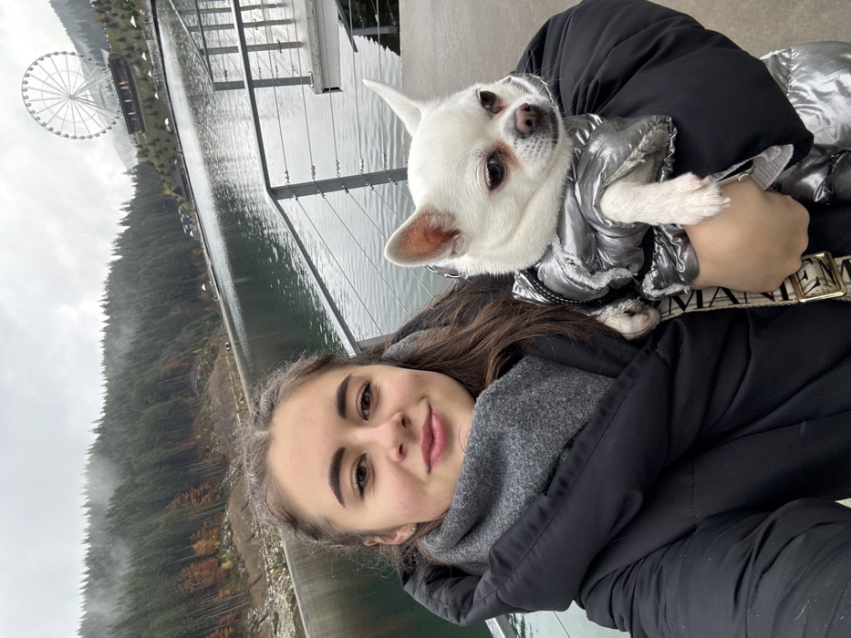 A female subject, appearing to be a young adult, is depicted in a close-up, selfie-style photograph, holding a small white Chihuahua dog
