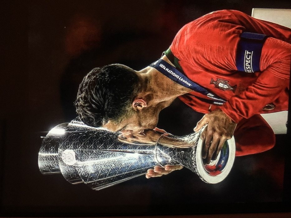 - "A male individual, identified as a footballer, is captured in profile, engaged in the act of kissing a large, silver UEFA Nations League trophy" by FM-q7EDs2, licensed under CC BY 4.0