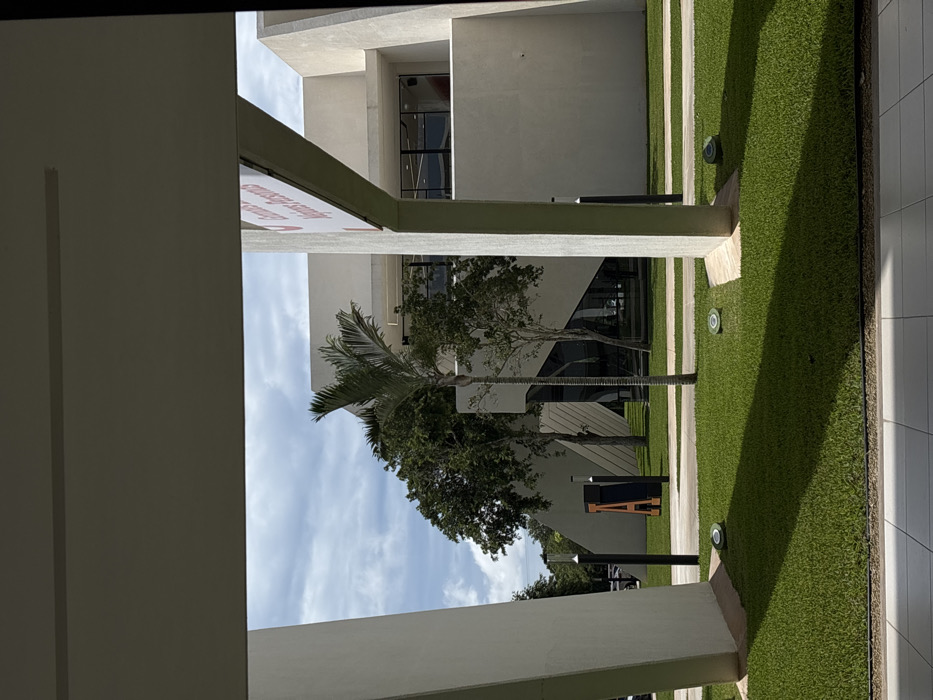 The image depicts an exterior view framed by modern concrete architectural elements, located in Chablekal, Mexico
