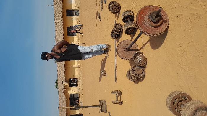 The scene depicts an outdoor environment on a dry, sandy surface under a clear blue sky in Akwanga, Nigeria. A muscular Black male stands centrally, oriented slightly to his right, wearing a black tank top, light blue jeans, brown boots, dark sunglasses, and a black cap. His hands are positioned behind his back. Scattered across the sandy ground are multiple pieces of makeshift weightlifting equipment, predominantly fabricated from repurposed, rusted metal industrial components such as gears and flywheels. Notable objects include a large barbell with circular weight plates in the foreground, a smaller dumbbell-like object to the left, and a tall, dark metal pole fixed vertically in a base on the left side. Long shadows are cast from the subjects and objects, indicative of direct sunlight. In the background, a weathered, single-story building with light yellow walls and a dark thatched roof is visible, featuring several open windows and doors. Two individuals are present near the building; one wears a red shirt and the other a light-colored shirt and jeans. Additional figures are partially discernible within the building's window openings.