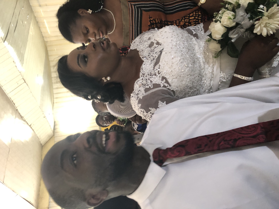 The scene depicts an indoor social gathering in Lokoja, Nigeria, focusing on three individuals in the mid-ground. In the left foreground, a dark-skinned male with a beard and short dark hair is visible from the upper chest, facing right. He wears a white collared shirt and a red and black paisley-patterned tie. His mouth is slightly open. Centrally, a dark-skinned female, identified as a bride, is visible from the waist up, also facing right. Her dark hair is styled upwards with multiple pearl-decorated pins. She wears a white wedding gown with a sequined bodice, lace sleeves, and a lace-trimmed neckline. Her makeup includes prominent winged eyeliner. She wears pearl drop earrings and a silver-toned bracelet on her left wrist. Her left hand holds a bouquet of white roses and other white flowers with green foliage. A small white fan is partially visible near her right shoulder area. Her mouth is slightly open. To the right, positioned slightly behind the central female, a second dark-skinned female is visible from the upper chest. She wears an off-shoulder garment featuring brown, orange, and black striped patterns, a pearl necklace, and large white floral-shaped earrings. Her dark hair is pulled back. The background indicates an indoor event space with a light-colored, draped ceiling and light-colored, possibly striped, wall coverings. Blurred figures are visible in the deeper background, suggesting a crowded environment.