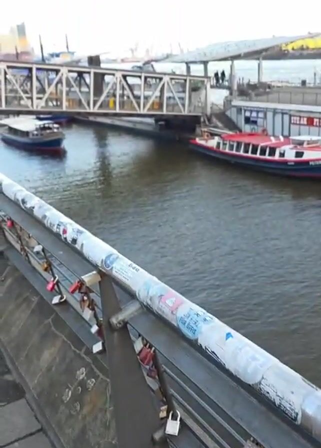view from a bridge towards a canal in a city setting, possibly Hamburg, Germany. A pedestrian bridge with a white steel structure is visible over the canal. Two boats are in the water: a dark blue boat moving towards the viewer, and a red and white boat docked nearby. The railings of the bridge are decorated with many love locks and stickers. The sky is light blue with some faint clouds, suggesting it's either early morning or late afternoon. In the background, buildings and cranes from the harbor area can be seen. No people are clearly visible in the immediate foreground, although some figures can be made out on the pedestrian bridge in the distance.