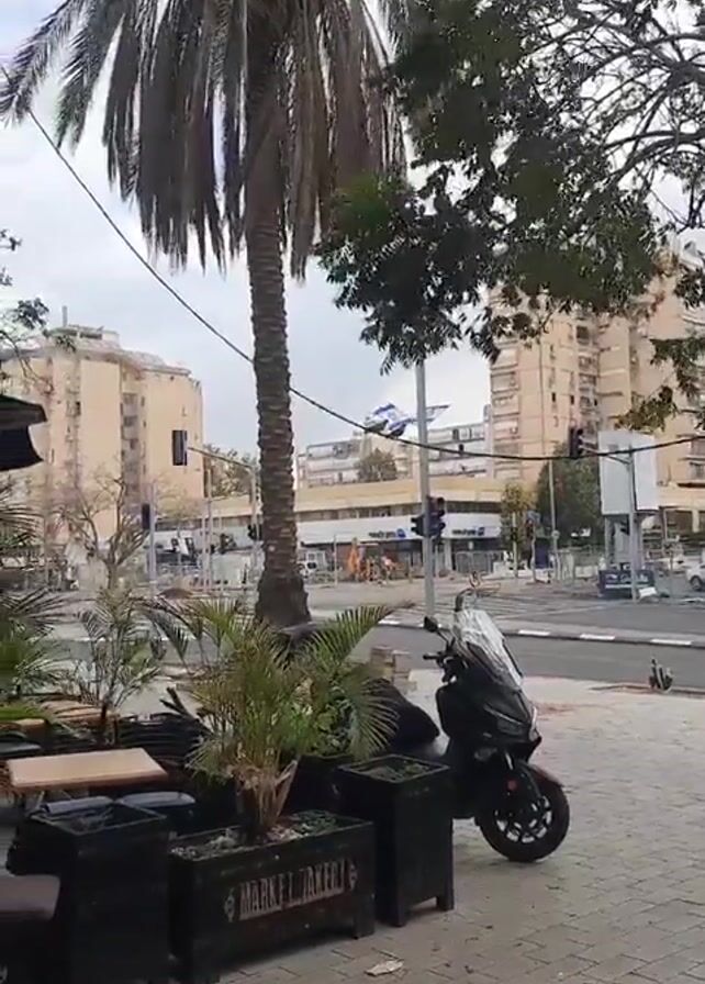 The video presents an outdoor scene in what appears to be an urban setting, likely during the day. The sky is overcast. There is a palm tree on the left side of the frame, with other trees also visible. A black scooter is parked on the paved sidewalk next to a set of tables and chairs which are part of a sidewalk cafe. The cafe has planters that say "Market Bakery" on them. In the background, apartment buildings and a crosswalk are visible, along with traffic signals and a small amount of car traffic.