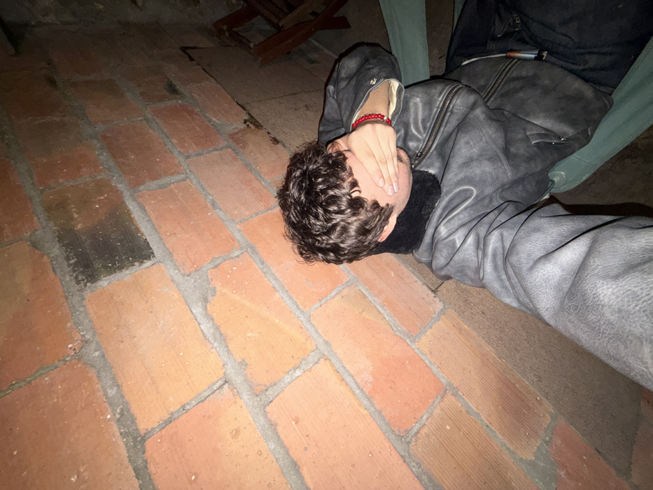 A male individual is depicted in an indoor or semi-enclosed location within Montrouge, France. He is seen reclining or lying down, facing upwards towards the camera, with his right hand covering his eyes and nose. He has short, curly brown hair. He is wearing a dark grey, distressed-texture jacket with a prominent black shearling or faux fur collar, and dark trousers. A red beaded bracelet is visible on his left wrist. The individual is positioned on a green fabric surface. The background consists predominantly of a reddish-orange brick wall with light grey mortar, exhibiting some dark discoloration on several bricks. In the upper right corner, a darker wall section and a partially visible wooden object, possibly a chair, are discernible in low light. The scene is illuminated by localized artificial light.