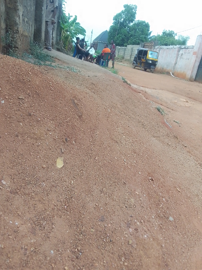 dirt road in Ukwu-Abwa, Nigeria. The foreground is a steep embankment of reddish-brown soil. A group of people are gathered on a slightly higher ground, a short distance beyond the embankment. Some of them are sitting on chairs. A small, yellow auto-rickshaw vehicle is visible on the road in the background, near a wall. A person is standing next to the wall.