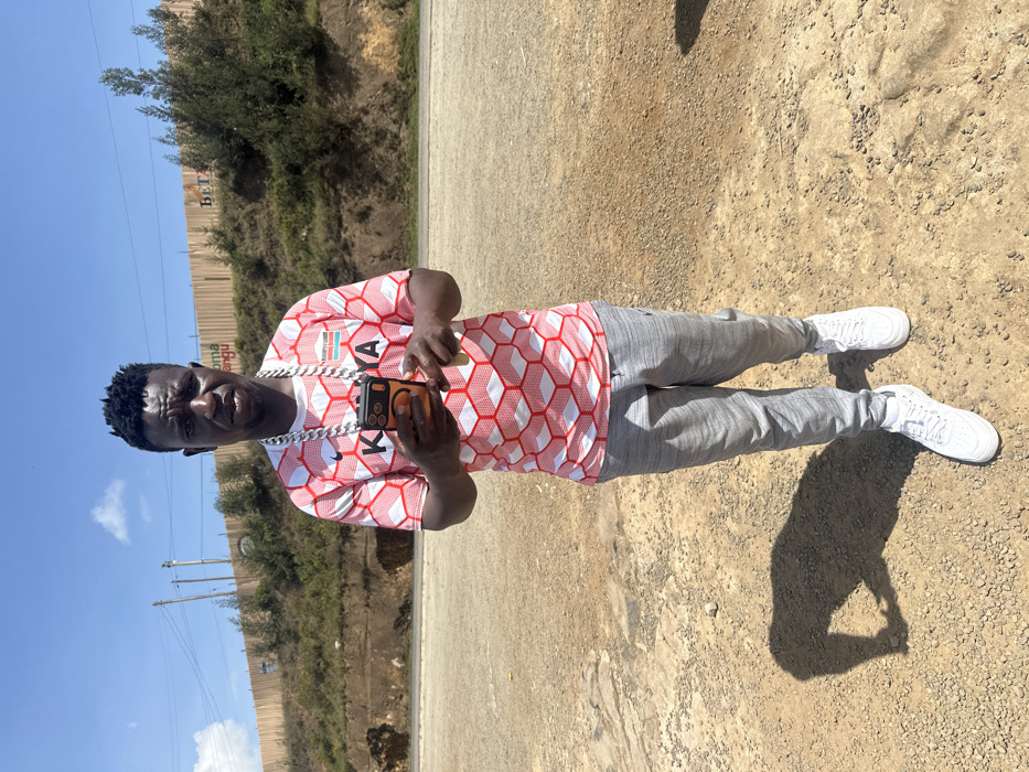 An adult male with dark complexion and short, textured dark hair stands facing the camera outdoors under clear blue skies in Lari/Kirenya ward, Kenya