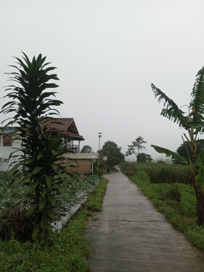 A concrete path stretches into the distance, disappearing into fog. Flanking the path, lush greenery and cultivated plants meet the edges. A two-story house with a brown-tiled roof sits to the left, next to a bamboo structure. Tall plants, one leafy and one banana tree, frame the path on either side. A lamp post stands further down the road, contributing to the tranquil, slightly misty atmosphere.