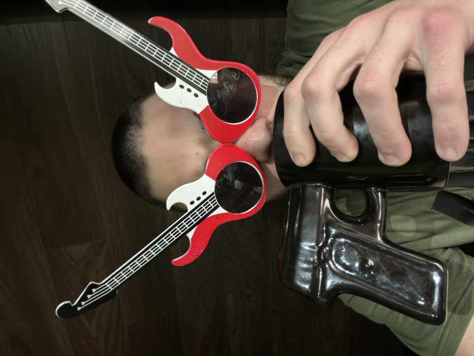 A close-up, chest-up portrait depicts an individual, likely an adult male, indoors in the city of Haskovo, Bulgaria. The subject presents with short dark hair and facial stubble, wearing an olive green garment. Novelty sunglasses, featuring frames shaped as two red and white electric guitars with dark, reflective lenses, obscure the subject's eyes. The subject is holding a plain black cylindrical mug to the mouth with the right hand, appearing to drink. Positioned to the subject's left, a second novelty mug shaped like a metallic silver-grey handgun is visible, held by the subject's left hand. The handgun mug's barrel points to the viewer's left. The background consists of a dark brown surface, possibly a wooden wall with horizontal planks.